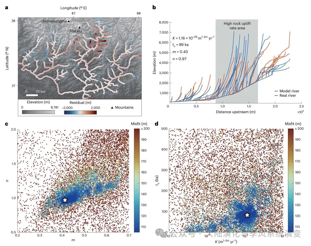 【图2】科西河流域重建的河流剖面与相关参数 (a. 最佳模拟结果残差分布; b. 模拟河流与实际河流剖面对比; c, d. 模拟反演结果,星号显示了最佳模拟结果位置)
