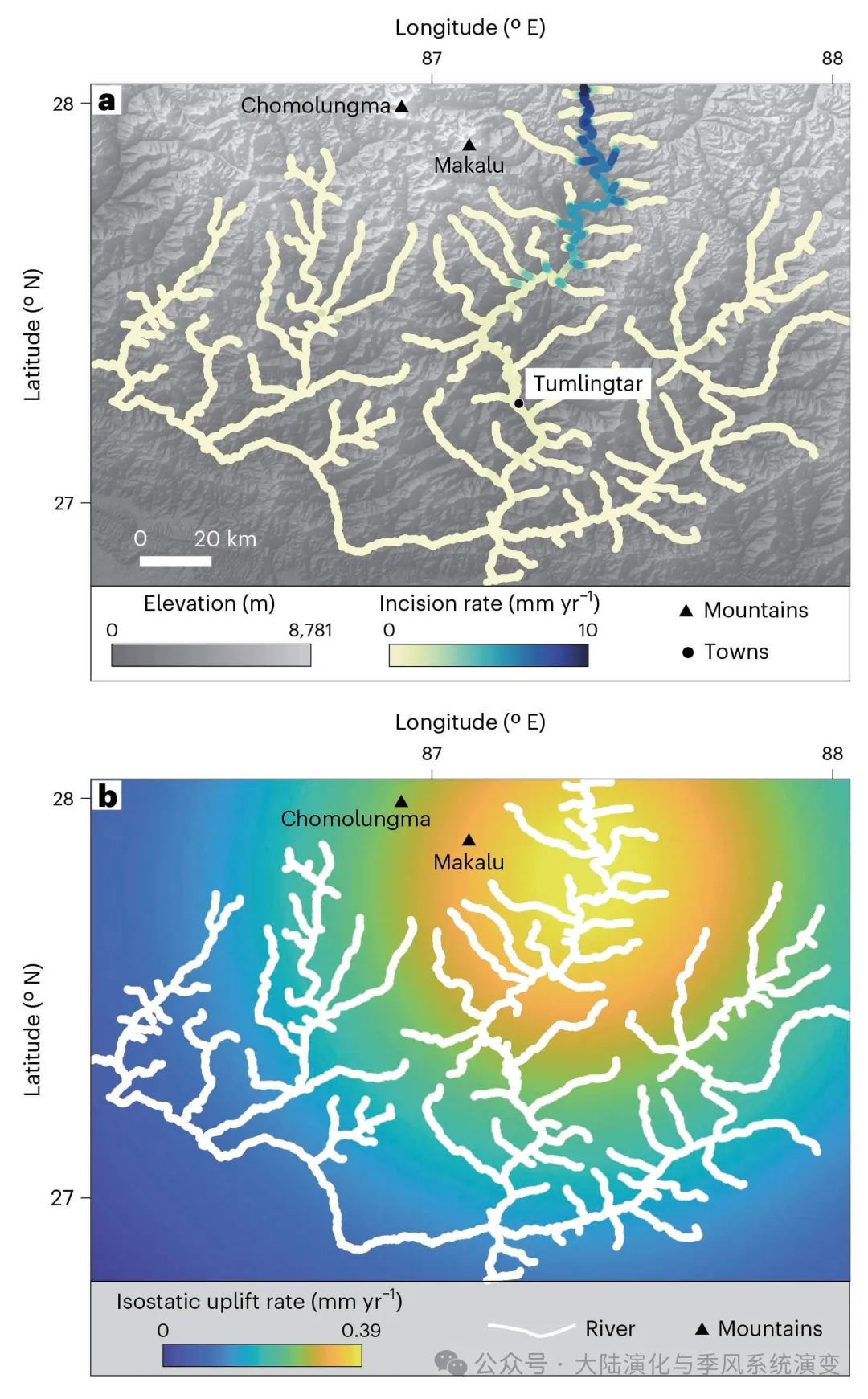 对现代科西河水系的上下游河道特征对比研究表明(图1b),该河流处于不稳定状态,极有可能是古阿润河袭夺(指一条河流通过侵蚀“抢走”另一条河流的水流)古朋曲的结果。为此,研究团队根据野外考察的结果,结合水力侵蚀模型与非线性反演方法,重建了古阿润河袭夺古朋曲的过程。最佳模拟结果很好地拟合了现今的河道剖面(图2a和b),表明袭夺事件发生在距今约89,000年前。袭夺发生后,袭夺点下游的河流因上游流域面积与流量增加而开始快速下切,最高下切速率可达12 mm/yr(图3a)。这种下切不仅降低了河道的高程,还导致周围区域的岩石因均衡反弹而隆起。河流袭夺引发的均衡反弹可使珠峰的隆升速率增加0.2-0.5 mm/yr(图3b),使珠峰增加了15-50米的异常高度。这一过程不仅影响了珠峰还波及了周围的山峰,如洛子峰和马卡鲁峰,二者隆升幅度与珠峰相似,促使它们在高峰排名中上升。