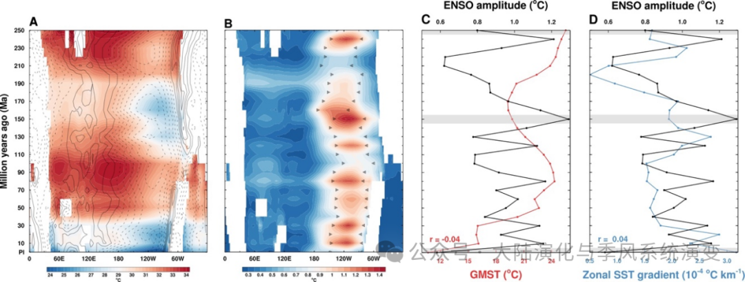 图2  过去2.5亿年来赤道海表温度和ENSO演变。(A)填色为赤道地区海表温度,等值线为海表纬向风,(B)海表温度的年际变率,其中赤道东太平洋的东西边界由黑色三角形标出。(C)ENSO振幅和GMST的演变,黑线为ENSO振幅,红线为GMST。(D)ENSO振幅和赤道太平洋纬向海表温度梯度的演变。灰色阴影标出了图1中的3个时期:250 Ma、150 Ma和PI。
