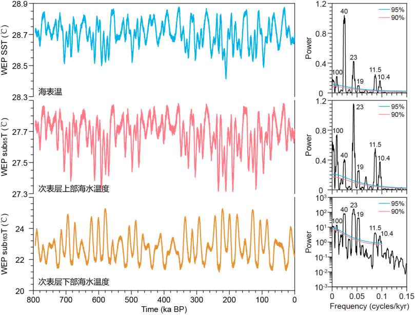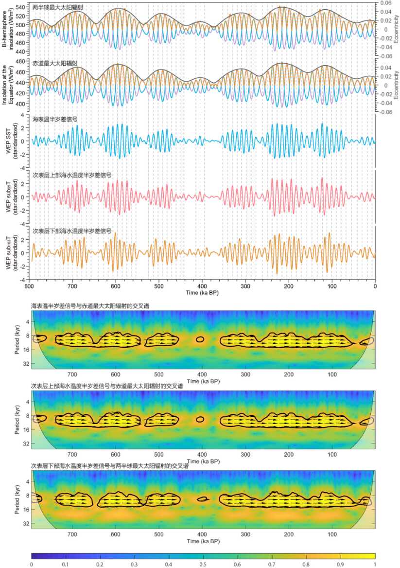 半岁差信号(周期约1万年)是赤道地区太阳辐射变化的独特特征(Berger et al., 2006),也是“低纬驱动理论”的核心内容之一。这一信号在轨道和千年尺度气候的相互作用、高低纬气候的相互作用中扮演着重要角色,并在第四纪的一些重大气候事件中发挥了关键作用。然而,由于地质记录的分辨率和年代学等限制,目前关于半岁差信号的研究仍相对较少。 赤道西太平洋是全球最大的暖水储库之一,在全球气候系统中扮演着类似“蒸汽与热量引擎”的角色。该区域的温度变化不仅影响全球气候,还对全球生态系统、农业生产和人类社会生活产生深远影响。研究赤道西太平洋温度的半岁差信号,有望成为全面理解全球半岁差信号的关键突破口。由于赤道西太平洋直接受到赤道太阳辐射的影响,理论上应存在半岁差信号。然而,迄今为止相关的研究报道很少(Jian et al., 2020),这仍是一个未解之谜。 在本研究中,比利时新鲁汶大学(UCLouvain)尹秋珍教授团队联合800彩票郭正堂院士团队,采用古气候模拟与地质记录相结合的方法,深入探讨了赤道西太平洋温度变化的半岁差信号及其驱动机制(Wu et al., 2025)。该研究首先对前人发表的赤道西太平洋五个钻孔的高分辨率温度记录进行再分析,发现了显著的半岁差信号。然而,由于地质记录中可能存在的定年误差以及局地因素的影响,仅凭地质记录难以深入探讨半岁差信号的驱动机制。因此,该研究进一步基于自主模拟实验,对三组过去80万年的瞬变气候模拟进行了详细分析。模拟结果显示,在轨道驱动作用下,赤道西太平洋海温中存在非常显著的半岁差周期 (图1),其变化幅度受到偏心率调控(图2)。模拟结果进一步表明,赤道西太平洋表层和次表层上部海水温度的半岁差信号是对赤道最大太阳辐射的直接响应,而次表层下部海温的半岁差信号则受控于两半球最大太阳辐射(图2)。这种不同深度半岁差信号在驱动机制上的差异与赤道西太平洋在不同深度上的洋流特征密切相关。在次表层下部,局地环流是由两半球亚热带通过西边界流流向赤道西太平洋(图3),使得次表层下部的海水受到两半球亚热带海水的影响,从而受到两半球最大太阳辐射的影响;相反地,在表层和次表层上部,局地环流是由赤道通过黑潮和东澳大利亚流分别流向两半球中高纬,其海水温度直接响应赤道最大太阳辐射,进而对两半球的气候产生影响。而位于次表层上部和下部之间的转换层,海温的半岁差信号不显著。 该研究还探讨了太阳辐射、CO2和北半球冰盖对赤道西太平洋海温的相对影响。发现在轨道单驱动下,除半岁差信号外,赤道西太平洋表层和次表层海温均存在显著的岁差、斜率和偏心率周期(图1)。表层和次表层上部温度主要受控于CO2的变化,以10万年周期为主,冰盖的影响相对较小;而次表层下部主要受控于太阳辐射,其温度变化以岁差和斜率信号为主。CO2和冰盖会进一步调控由太阳辐射引起的半岁差信号,但基本不改变上述半岁差信号与相应太阳辐射的关系。 鉴于赤道西太平洋在全球气候中的重要性,本研究探讨的赤道西太平洋温度变化的半岁差、岁差、斜率和10万年的周期信号有望为理解其他地区相应周期信号提供参考。