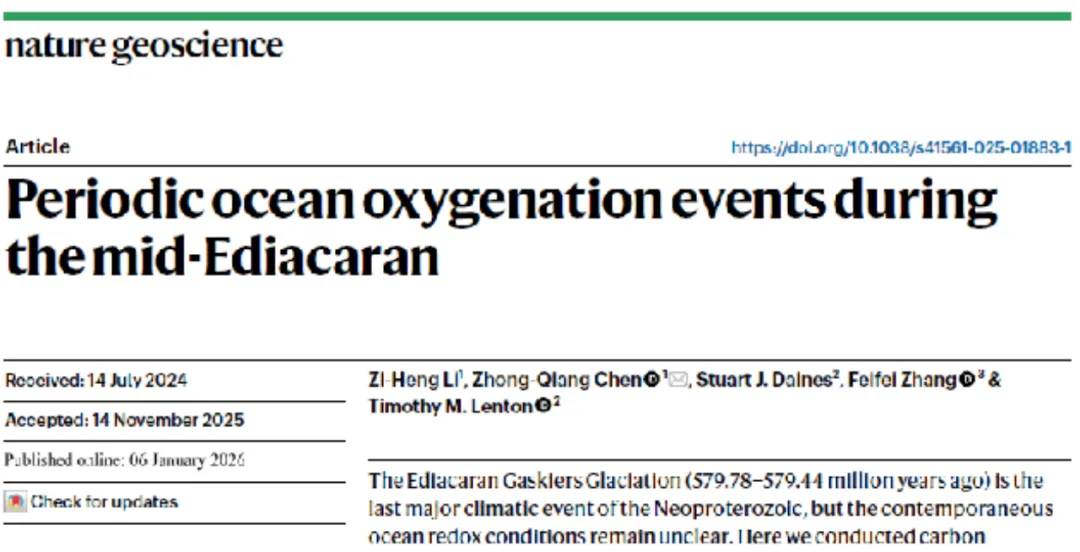 1月6日,中国地质大学(武汉)地质微生物与环境全国重点实验室陈中强教授团队联合英国埃克塞特大学、南京大学团队,在《自然·地学》(Nature Geoscience)发表重要研究成果。该研究通过前沿的数值模拟方法,首次系统揭示了约5.8亿年前地球海洋氧化过程的非线性特征,指出全球海洋曾经历剧烈而规律的周期性“氧化脉冲”。这一发现革新了我们对早期地球环境演变模式的理解。文章第一作者为地质微生物与环境全国重点实验室李子珩博士;陈中强教授为唯一通讯作者;埃克塞特大学蒂姆·伦顿(Tim Lenton)教授和斯图尔特·戴恩斯(Stuart Daines)博士和南京大学张飞飞教授参与了本项工作。