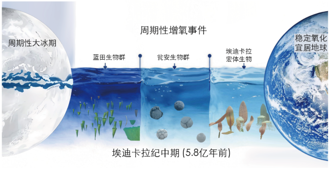 图3. 地球系统碳-氧-磷-铀(C-O-P-U)耦合系统状态示意图。 重塑生命-环境协同演化认知该模拟研究首次为早期复杂生命的“爆发式”出现提供了动态环境背景框架。模型显示的三次氧气脉冲高峰期,在时间上与全球最早一批复杂多细胞生物群(如中国的“蓝田生物群”、“瓮安生物群”等)的繁盛期高度吻合。这表明,是地球系统自身的周期性振荡,而非缓慢的线性增氧,为生命复杂化创造了关键的“机会窗口”(图4)。 “这项研究从根本上改变了我们的视角。”陈中强教授指出,“地球从长期缺氧向富氧状态的过渡,并非平静的‘渐变’,而是必然要经历一个充满剧烈波动的‘动荡青春期’。数值模拟帮助我们捕捉到了这一系统转换期的本质规律。” 方法学与学科意义深远此前,该团队《自然·通讯》上发布了自主研发的“自持振荡”数值模型框架(Li et al., 2025),本次研究成功将该模型应用于更古老的地质历史事件解析,并取得了实证支持和延续性突破,展现了数值模拟在深时地球科学研究中的强大能力。