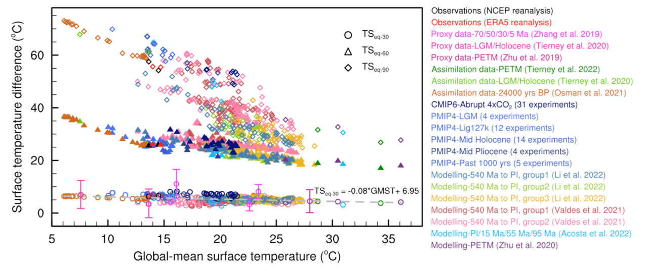 图1. 观测、再分析和模式模拟的不同气候态下纬向平均地表温度差。图中横轴为全球平均地表温度,纵轴为温差:圆圈为赤道与南北纬30度之间的温差,三角形为赤道与南北纬60度之间的温差,菱形为赤道与南北纬90度之间的温差。 二、 一个被长期忽视的物理规律为检验这一现象的普遍性,研究团队系统整合了多源数据与模拟结果(图2)。综合分析表明:尽管全球平均温度在 6.2°C 至 36.1°C 之间大幅变动,全球季风格局、哈德利环流强度、海洋经向热输送、冰盖范围等发生了显著变化,但赤道与南北纬30°之间的温度差变化幅度很小。其相对于全球平均温度的线性回归斜率仅为 -0.08,意味着全球平均温度每变化50°C,热带南北温差仅改变约4°C(图1)。相比之下,中高纬度温度梯度的变化幅度可达其数倍至数十倍。 “以往研究因考察的气候状态变化幅度较小,常将热带温差的小幅变化视作偶然,而未将其视为一条物理规律,”论文通讯作者杨军指出,“我们的工作表明,这种准不变性在极宽的气候范围内均成立,其背后应由更基本的物理机制所主导。”