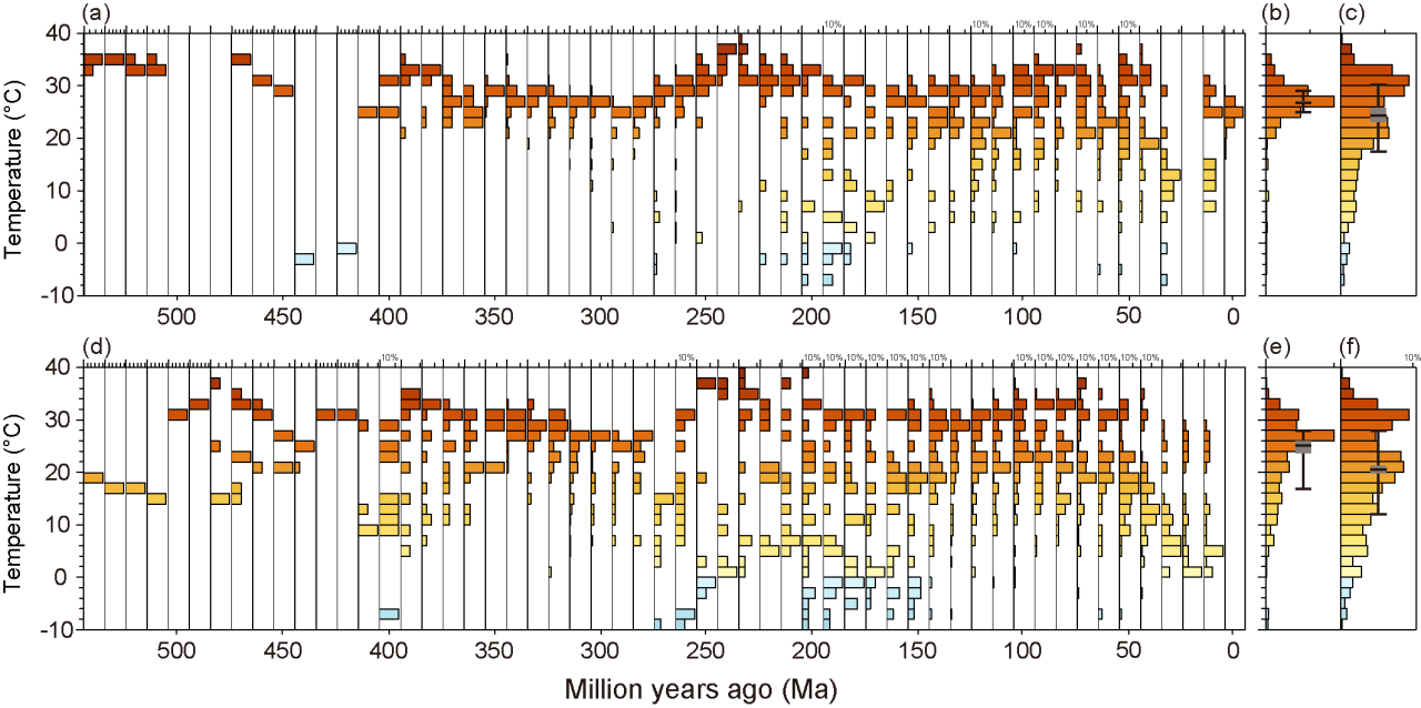 图1 显生宙铝土矿和高岭土矿地质记录对应的年平均地表温度。(a) 5.4亿年至今铝土矿对应的温度,(b) 5.4-2.6亿年的铝土矿温度总分布,(c) 2.5-0.1亿年的铝土矿温度总分布,(d) 5.4亿年至今高岭土矿对应的温度,(e) 5.4-2.6亿年的高岭土矿温度总分布,(f) 2.5-0.1亿年的高岭土矿温度总分布。