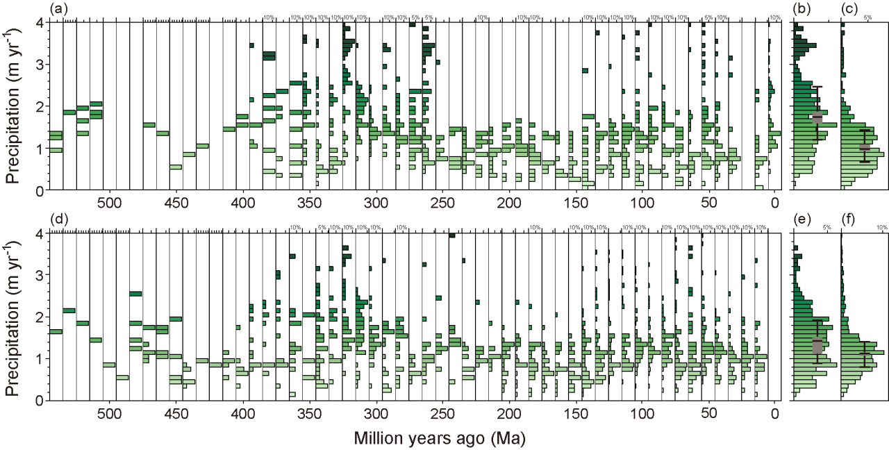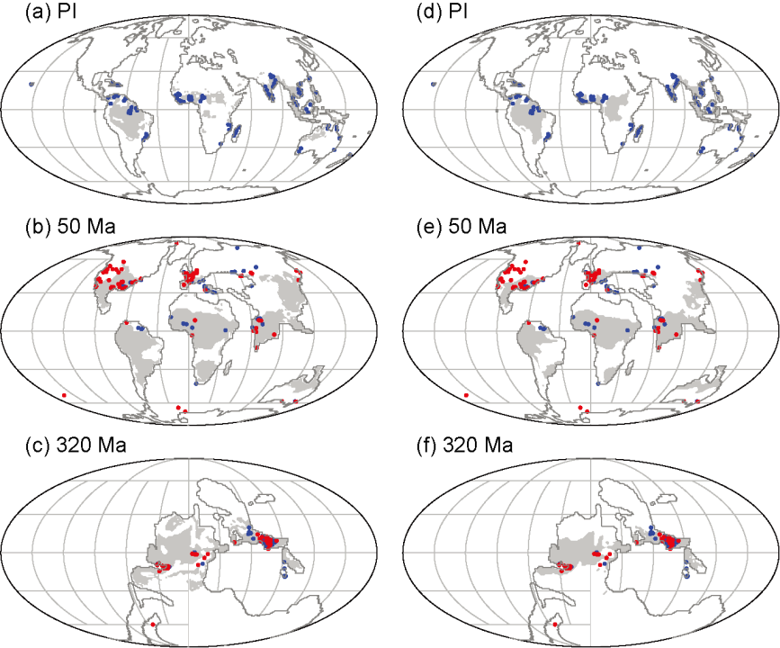 图2 显生宙铝土矿和高岭土矿地质记录对应的年平均降水。(a) 5.4亿年至今铝土矿对应的降水,(b) 5.4-2.6亿年的铝土矿降水总分布,(c) 2.5-0.1亿年的铝土矿降水总分布,(d) 5.4亿年至今高岭土矿对应的降水,(e) 5.4-2.6亿年的高岭土矿降水总分布,(f) 2.5-0.1亿年的高岭土矿降水总分布。 研究还表明,降水的季节性变化在铝土矿和高岭土矿形成过程中发挥关键作用,短期的干燥期对其形成有重要作用,而不是全年都是雨季。降水的季节性通过调节地下水位和化学反应路径,这对驱动元素的迁移、分异与富集至关重要。 铝土矿和高岭土矿与温度和降水之间的定量关系可以用来“预测”不同地质时期的空间分布(图3),这对勘探矿产提供了依据。