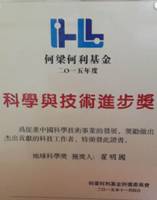 11月4日,2015年度何梁何利奖颁奖大会在北京举行,大陆动力学国家重点实验室主任翟明国院士荣获何梁何利基金科学与技术进步奖-地球科学奖。何梁何利基金评价:翟明国研究员作为前寒武纪地质与变质地质学研究领域的学科带头人,在国内外具有重要影响;他针对早期陆壳的形成与生长、早期大陆的结构与成分、大陆成矿演化等前沿科学问题,集中研究华北及欧亚相邻地区,并进行全球对比,取得系统性研究成果;他提出的早期陆壳多阶段生长、古元古代初始板块构造以及对克拉通下地壳结构的理论模型在国际上有重要影响;他创建和领导的团队是活跃在国际地质领域的优秀科研群体。