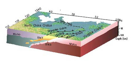 沿着南-北中国陆-陆碰撞边界(商丹缝合带和勉略缝合带),扬子克拉通向北俯冲到华北克拉通下方。