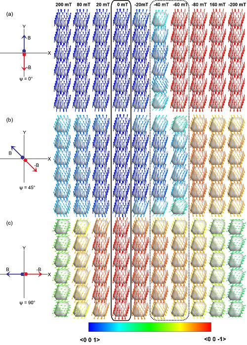 800彩票地球深部结构与过程研究室、中-法生物矿化与纳米结构联合实验室李金华副研究员和古地磁与年代学实验室(PGL)博士生葛坤鹏等人合作,在实验室将趋磁细菌排列制备成定向磁小体链样品(图1),系统测量了定向磁小体链的常温和低温岩石磁学性质(图2),并结合微磁结构模拟,研究了磁小体链的磁化行为和磁学性质(图3)。结果表明:(1)磁小体磁铁矿拉长并沿颗粒长轴排列成链,产生显著的磁各向异性,能有效制约链内颗粒的磁化方向(等效为一个USD颗粒)。研究还首次表明,磁小体链磁化方向的反转具有外加磁场强度和方向双重依赖性,在靠近磁小体链方向变化外加场强度和方向时,其磁化方向的反转遵守球链模型的非一致转动模式(Non-coherent reverse in the model of chain of sphere),而在接近垂直链方向上,其磁化方向则逐渐变为一致转动(图3)。(2)磁小体链的磁各向异性显著影响样品的宏观磁学性质,其磁滞回线(Hysteresis loop)、饱和等温剩磁(IRM)获得和退磁曲线、一阶反转曲线图(FORC图)、低温磁学性质(ZFC、FC和LTC曲线)及其Vewery转换行为均具有显著的方向依赖性。相应磁学参数,包括矫顽力(Bc)、剩磁矫顽力(Bcr)、饱和剩磁(Mrs)、剩磁比(Mrs/Ms)、FORC特征矫顽力(Bc,FORC)、Moskowitz检验(δFC、δZFC和 δ比)等均随加场测量角度ψ的增加而系统变化(图2和4)。(3)定向磁小体链的磁学性质的各向异性与样品内磁小体链的定向程度密切相关,相比较,Mrs/Ms似乎比Bc对磁小体链的定向排列更为敏感,微弱的定向就会引起Mrs/Ms 显著的各向异性。这表明,在识别和应用化石磁小体时,我们不能忽视样品可能的定向及其产生的磁学效应。