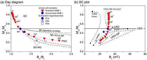 图4 磁小体链的空间排列(定向或坍塌)对Day图和SC图的影响