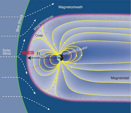 地磁场与太阳风的相互作用形成了磁层。磁层的最外边界层称为磁层顶,它定义了磁层的大小。磁层可以使来自太阳的高能粒子偏转方向,对地球生物、人造卫星和空间站等形成有效的保护(1)。磁层顶的位置是由地磁场压力和太阳风压力平衡决定的。通常情况下地球磁层顶日下点距离位于10个地球半径附近。但是在极端太阳风条件下,磁层顶会压缩至同步轨道以内。这将导致同步轨道卫星故障风险大大增加。过去对磁层顶位置的研究仅考虑太阳风动压及行星际磁场等外部驱动因素。为了预测磁层顶的位置及位形,研究者们基于不同的磁层顶穿越事件的数据库建立了大量的磁层顶经验模型。但所有这些模型都只是针对当前的地磁场强度所建立。实际上,19世纪人们开始对地磁场进行连续的常规观测以来,地磁偶极磁场强度平均每百年衰减5-7%。地磁场的快速衰减将直接影响着磁层顶的位置。
