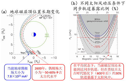 该项研究成果近期发表在美国地球物理期刊Journal of Geophysical ResearchZhong et al. Increasing exposure of geosynchronous orbit in solar wind due to decay of Earth's dipole field. Journal of Geophysical Research, 2014, 119: 9816–9822)。