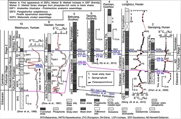 埃迪卡拉纪-寒武纪(E-C)转折期是隐生宙向显生宙过渡的关键时期,全球构造格局、海洋环境、及生物面貌均发生了重大转变。目前,E-C界线的全球界线层型剖面点(GSSP)被置于加拿大纽芬兰Fortune Island 的一套碎屑岩地层中,以遗迹化石Trichophycus pedum 首现为标志,但在碳酸盐岩地层中,常以埃迪卡拉生物群绝灭、小壳化石首现以及d13C负漂同现进行共同约束,得到的最佳绝对(U-Pb)年龄估值为541.00 ± 0.13 Ma。华南扬子地区E-C界线层系地层序列发育良好,生物演化明显,并保存了著名的、被认为是“寒武纪生命大爆发”第一个事件窗口记录者的“澄江动物群”,所以历来一直都是研究的热点区域。然而,对该区域的研究一直未获得华南寒武系底界的可靠年龄数据,这严重制约了全球及区域地层对比和对地质过程的解释,对海洋环境与生物协同演化的认识产生了严重影响。