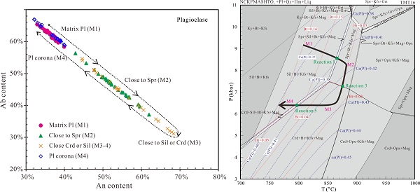 中科院800彩票岩石圈演化国家重点实验室博士后焦淑娟及合作者在长期对华北孔兹岩带进行变质作用研究的基础上,新发现了大青山地体一处含假蓝宝石变质岩。该岩石为典型的富Mg-Al变泥质岩,不但保留了进变质矿物组合,还清楚地记录了各退变质阶段。这暗示着该岩石可能经历了快速的构造热演化历史。详细的岩相学研究揭示出该岩石共保存了四期矿物组合:第一期(M1)以残余的夕线石变斑晶和基质中的黑云母为代表;第二期(M2)以取代夕线石而新生成的假蓝宝石和磁铁矿为代表;第三期(M3)则以取代假蓝宝石而生长的堇青石和尖晶石为代表;最后一期(M4)以普遍发育的毛发状夕线石和退变黑云母为代表(图1)。该过程中过量或贯通性的矿物为Bt + Pl + Kfs + Qz + Ilm+ Mag/Spl + Liq。此外,他们还通过详细的矿物化学分析还识别出对应于上述各变质阶段不同的斜长石颗粒。在整个变质演化中,斜长石的Ca含量先升高(M1→M2),然后保持不变或略升高(M2→M3),最后不断降低(M3→M4,图2左)。热力学视剖面图模拟显示这样的矿物组合和成分变化指示了一个顺时针P-T轨迹,即一个先升温减压,再等温减压,最后等压冷却的热演化历史(图2右)。峰期温压条件为860-890 ℃和7.5-8.5 kbar(图2右)。锆石和独居石SIMS U-Th-Pb年代学结果显示该高温变质作用发生于约1.86Ga,并且其持续时间尺度小于15个百万年。
