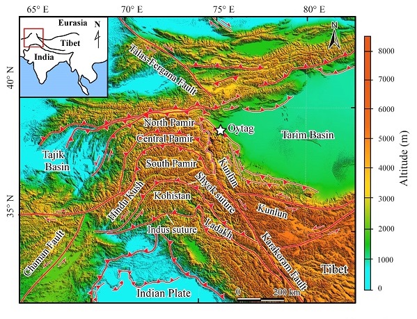 印度板块与欧亚板块的碰撞时间是青藏高原研究中历时时间最长、争议最大的热点问题之一。鉴于印度板块与欧亚板块的碰撞边界超过2000km,且印度板块与欧亚板块的碰撞作用在喜马拉雅造山带的东、西两端形成两个楔入“犄角”(东、西构造结),因此,印度板块究竟以何种方式与欧亚板块发生碰撞?在碰撞边界的不同地段具有怎样的碰撞时限?这些都是青藏高原研究中的重要问题。对西构造结而言,帕米尔弧形构造带的北缘在新生代至少向北推进了300-400 km,同时,地壳发生强烈的增厚缩短并伴随造山带的构造抬升以及帕米尔弧形构造带两侧前陆盆地的巨厚沉积。造山带与前陆盆地在空间上相互依存,因此,从盆山耦合的角度探讨造山带的构造演化历史,无疑是大陆动力学重要的研究方法之一。