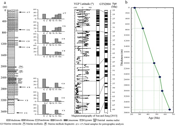 新生代地质与环境研究室孙继敏研究员与其合作者,对帕米尔东北缘前陆盆地奥依塔克剖面(图1),开展了砂岩成分、碎屑锆石的U-Pb年龄与Hf同位素、磁组构、稳定同位素物源示踪等综合研究。该剖面的下部夹有始新世的海相地层,他们此前在古生物化石基础上,结合磁性地层学序列,建立了该剖面~65-24 Ma以来的时间标尺(图2)。结合物源分析,他们提出帕米尔东北缘前陆盆地奥依塔克剖面47Ma以来物源发生重要改变,而这一改变与印度板块与亚洲南缘的科希斯坦-拉达克弧 (Kohistan-Ladakh) 的碰撞导致的造山带隆升与物质剥蚀有关。研究显示,碎屑锆石的U-Pb年龄谱在47Ma之后样品中新增了100-40Ma年轻的锆石组分,其侵入岩主要见于科希斯坦-拉达克弧 (Kohistan-Ladakh)以及毗邻的喀喇昆仑和南帕米尔地块,结合锆石的Hf同位素结果,他们认为在 47Ma以后,奥依塔克剖面新增了来自科希斯坦-拉达克弧以及喀喇昆仑的物源,排除了南帕米尔来源的可能性。此外,磁组构的结果表明磁化率与磁组构参数均在47Ma之后整体上显著增大,磁化率与磁组构参数之间的同步变化表明磁组构主要为沉积成因,二者在47Ma后的增强主要是新加入了磁性更强的来源物质,这与科希斯坦-拉达克弧以及喀喇昆仑地块100-40Ma期间大量的强磁性I-型花岗岩的后期剥蚀风化有关。碳酸盐组分的氧同位素以及全岩样品的Nd同位素曲线同样反映了47Ma之后的物源改变(图3)。