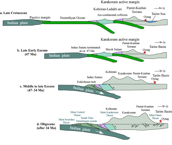 在上述工作基础上,他们还提出了西构造结的新生代演化模式(图4)。在晚白垩时(图4a),科希斯坦-拉达克弧沿Shyok缝合带与亚洲南缘碰撞,印度板块与科希斯坦-拉达克弧之间为新特提斯洋所隔;早始新世末期的47Ma(图4b),印度板块与科希斯坦-拉达克弧碰撞,结束了新特提斯洋在西构造结的存在历史;47-34 Ma (图4c),受印度板块向北的强烈挤压推覆作用,导致科希斯坦、喀喇昆仑地体的强烈抬升与物质剥蚀,来自该地的碎屑物质连同更北的造山带物质,被河流带入帕米尔东北缘的前陆盆地;34 Ma以后 (图4d),随着帕米尔弧形构造带呈突刺状向北强烈扩展和远程效应影响,帕米尔北缘不断隆升,逐渐阻隔了来自科希斯坦、喀喇昆仑地体的物质,新的物质来源以帕米尔、昆仑山地体为主。