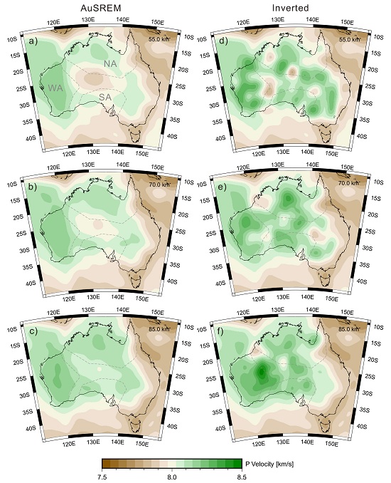 此外,他们根据前述经过多重验证的层析成像流程对澳大利亚区的上地幔顶部的Pn波速度结构进行了研究,研究表明,上地幔顶部的在横向和深度方向均存在很强的速度结构变化,澳大利亚的上地幔顶部的下边界分别深至95 km。该结果揭示了可能存在更为复杂的动力学过程,丰富了对地球深部和浅部相互作用的认识。