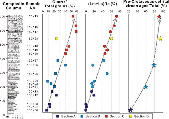 图1 当雄砾岩垂向物源特征变化反映源区剥露过程