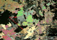由日本国立科学博物馆、东京大学和北海道大学合作研究,在内蒙白云鄂博发现新矿物Yangzhumingite(杨主明云母) (2009)。正交镜下显微照片,红色箭头标志。 |