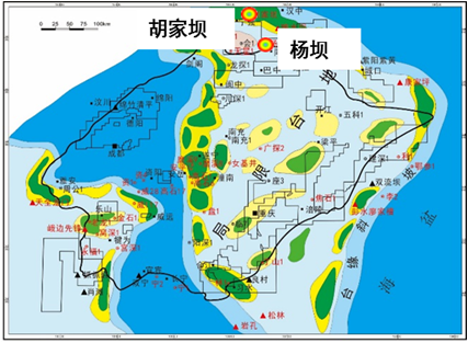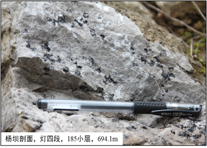 图2. 四川盆地两个剖面位置和杨坝剖面灯四段典型岩性及粒内孔沥青