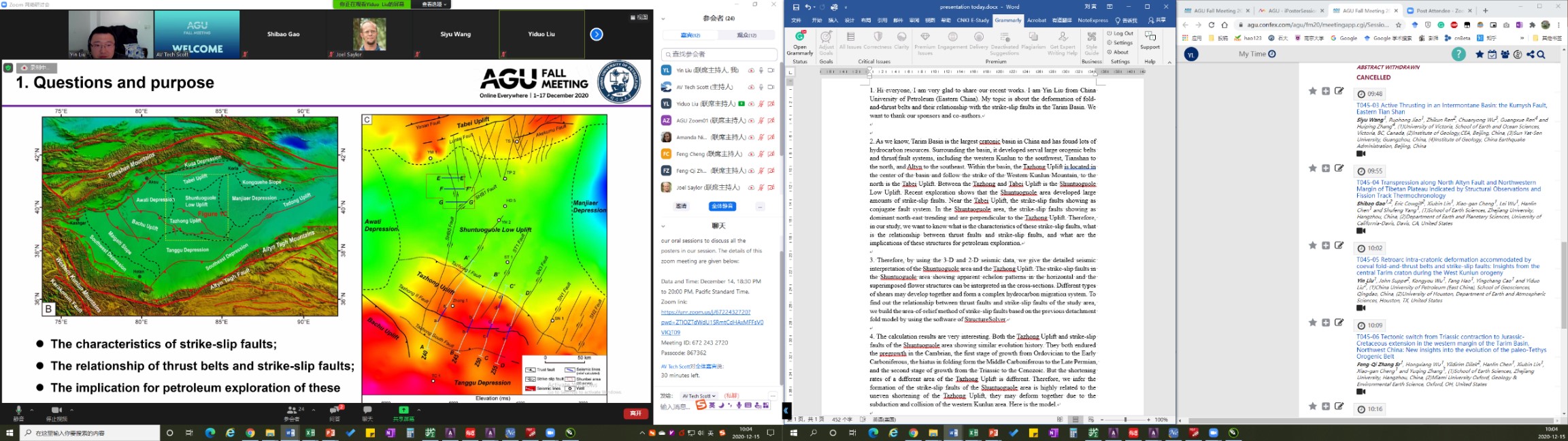2020年10月,刘可禹教授、杨磊磊和刘建良参加美国AAPG年会线上会议,刘可禹教授并担任专场报告主席;2020年12月14日,刘寅副教授在美国AGU年会做题为Retroarc intra-cratonic deformation accommodated by coeval fold-and-thrust belts and strike-slip faults: Insights from the central Tarim craton during the West Kunlun orogeny的口头报告。